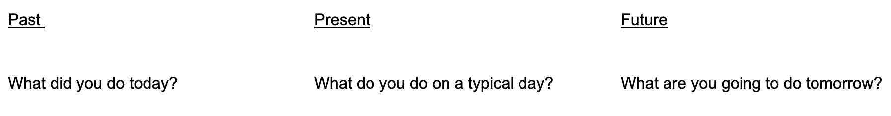 At the White Belt level, we practice the back-and-forth of questions and answers using Verb Starting Points. This is still the case at Red Belt level (in fact, it is still the case at every level), but now, we are drawing from the past, present, and future sections of the Verb Timeline.
