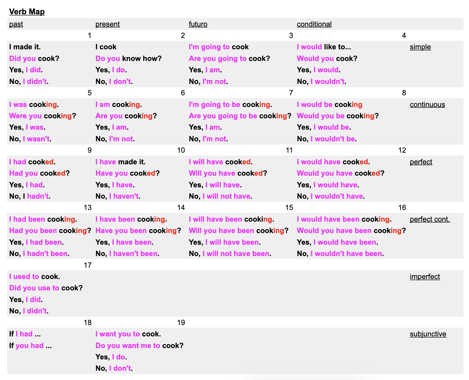 That is the English Verb Map. Not all languages have the same Verb Map. Use ChatGPT to find out what tenses and aspects your target language has. Usually it’s at least Past, Present, Future — Simple (maybe Continuous, and Perfect). Familiarize yourself with the tenses and aspects of the English Verb Map, then use ChatGPT to explore the language you’re learning.